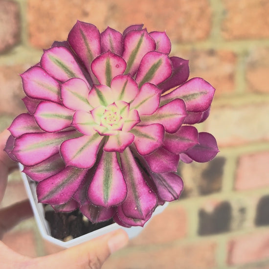 This Aeonium Mardi Gras Variegated rooted 6cm succulent Plant, one head, is perfect for both indoor and outdoor environments in the UK. The green with pink red plant, featuring green, red, pink hues, thrives in full sun with light watering. This slow-growing plant, part of the Aeonium genus, is heat resistant, evergreen, and safe for pets and children. Ideal for any room in the house, this plant comes with a flower pot and is sure to brighten up your space during the summer and spring seasons.