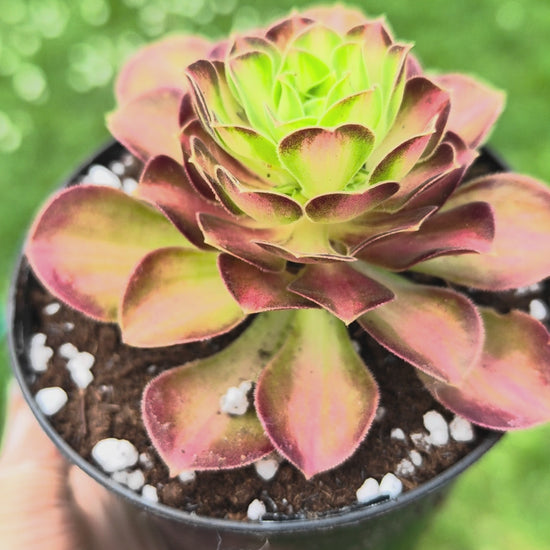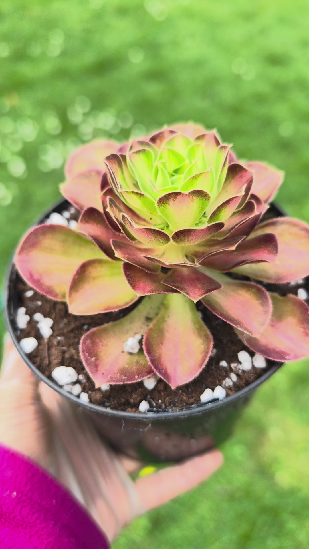 This Aeonium Yellow Witch Variegated succulent Plant, with a rooted 7cm width and one head, is perfect for both indoor and outdoor environments in the UK. The green with pink red plant, featuring green, red, pink hues, thrives in full sun with light watering. This slow-growing plant, part of the Aeonium genus, is heat resistant, evergreen, and safe for pets and children. Ideal for any room in the house, this plant comes with a flower pot and is sure to brighten up your space during the summer and spring seasons.