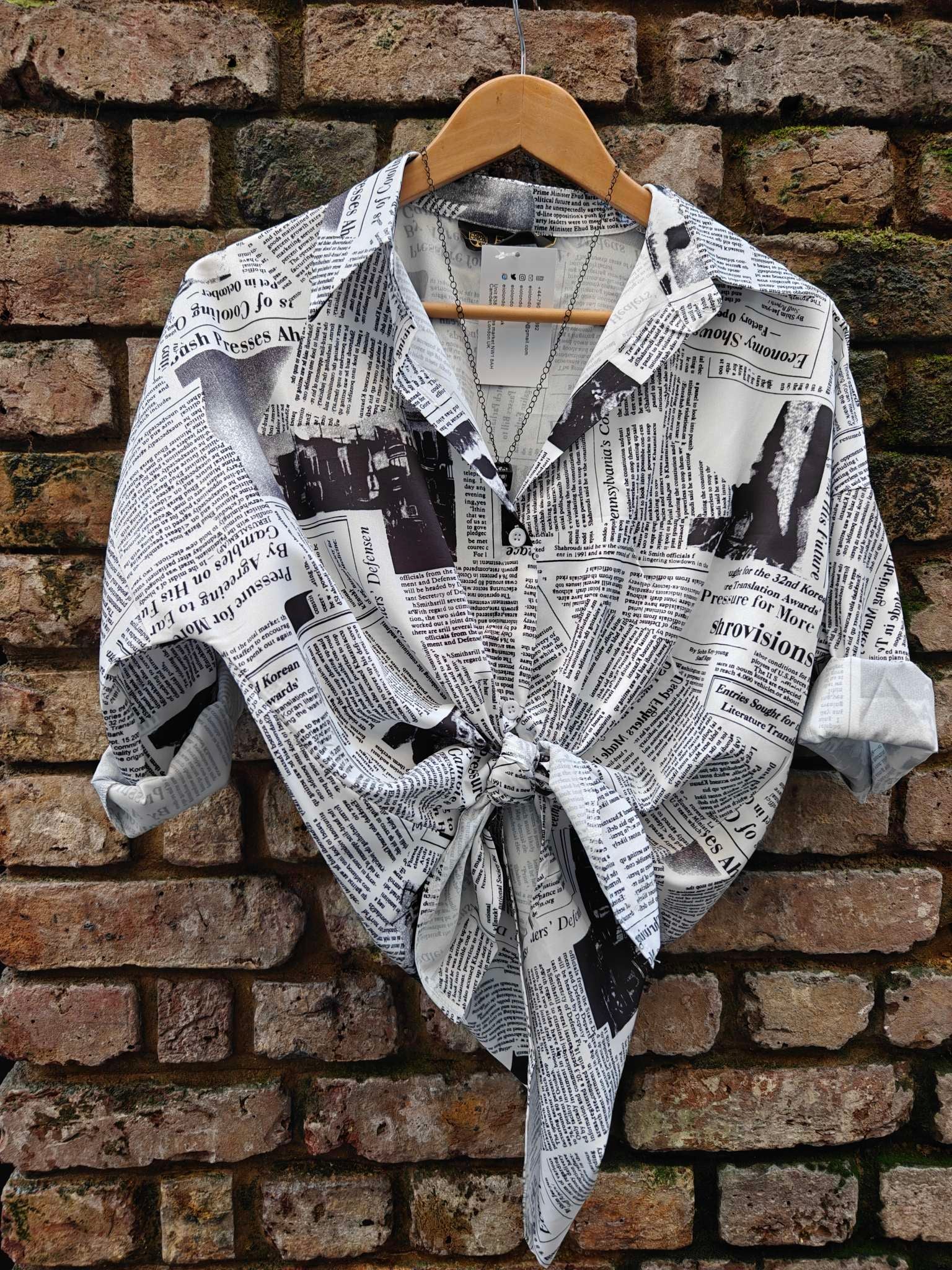 Baggy Black White Newspaper Vintage Style Satin Soft Silky Shirt